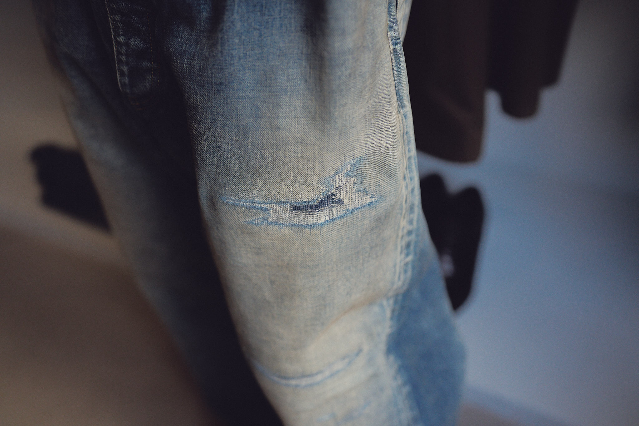 中出「どうしてこうなっちゃったんだろうっていう裾の破れはそのまま再現しました。わざと汚れたような茶色の擦れもあったり、かなり細かいところまでやり切ってます。穴を補強しているところも、新品を破って穴を開けてそれをリペアする、ということと、本当に履き潰して破れちゃった穴をリペアする、だと方法が違うんです。緯糸だけが切れてたりするじゃないですか。そういう再現も、すごく難しかったところですね」