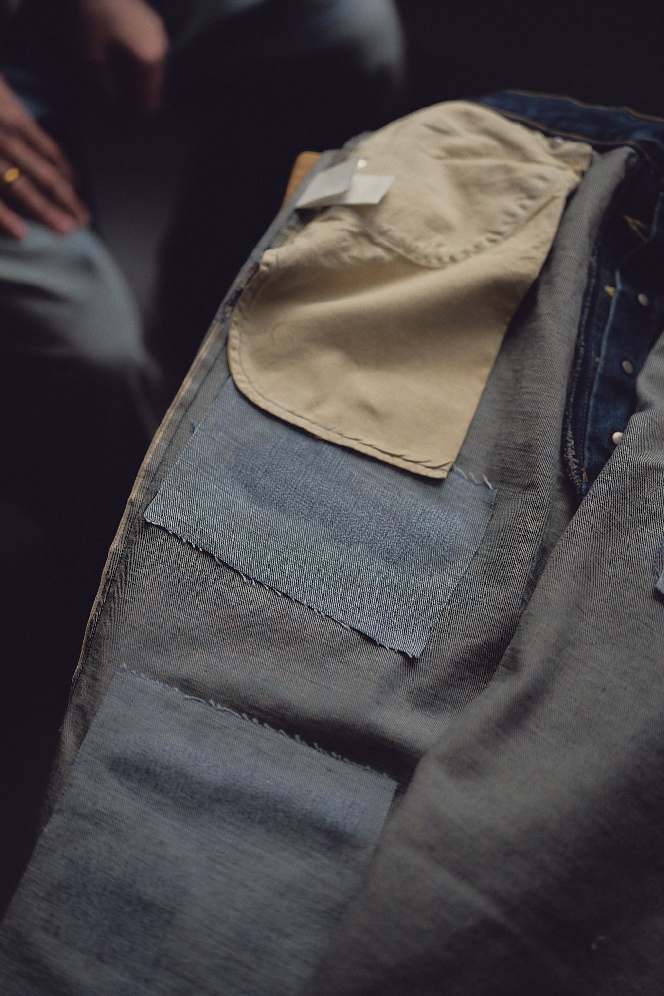 伊藤「裏側を見ると、元々の所有者がとりあえず手近にあったデニムで補強したんです、みたいなストーリーが見えるリペアの再現みたいになってて、そこにもぐっときましたね。きれいに丁寧に仕上げようみたいな狙いがないような雰囲気があると言えばいいんですかね。あと気になったところがあって、ウエストベルトの上のステッチってビンテージを模倣して作るとチェーンステッチじゃなくてシングルステッチになってたり、フロントボタン裏のところにVステッチが入ってたりするはずなんですけどそれがないんですよね」