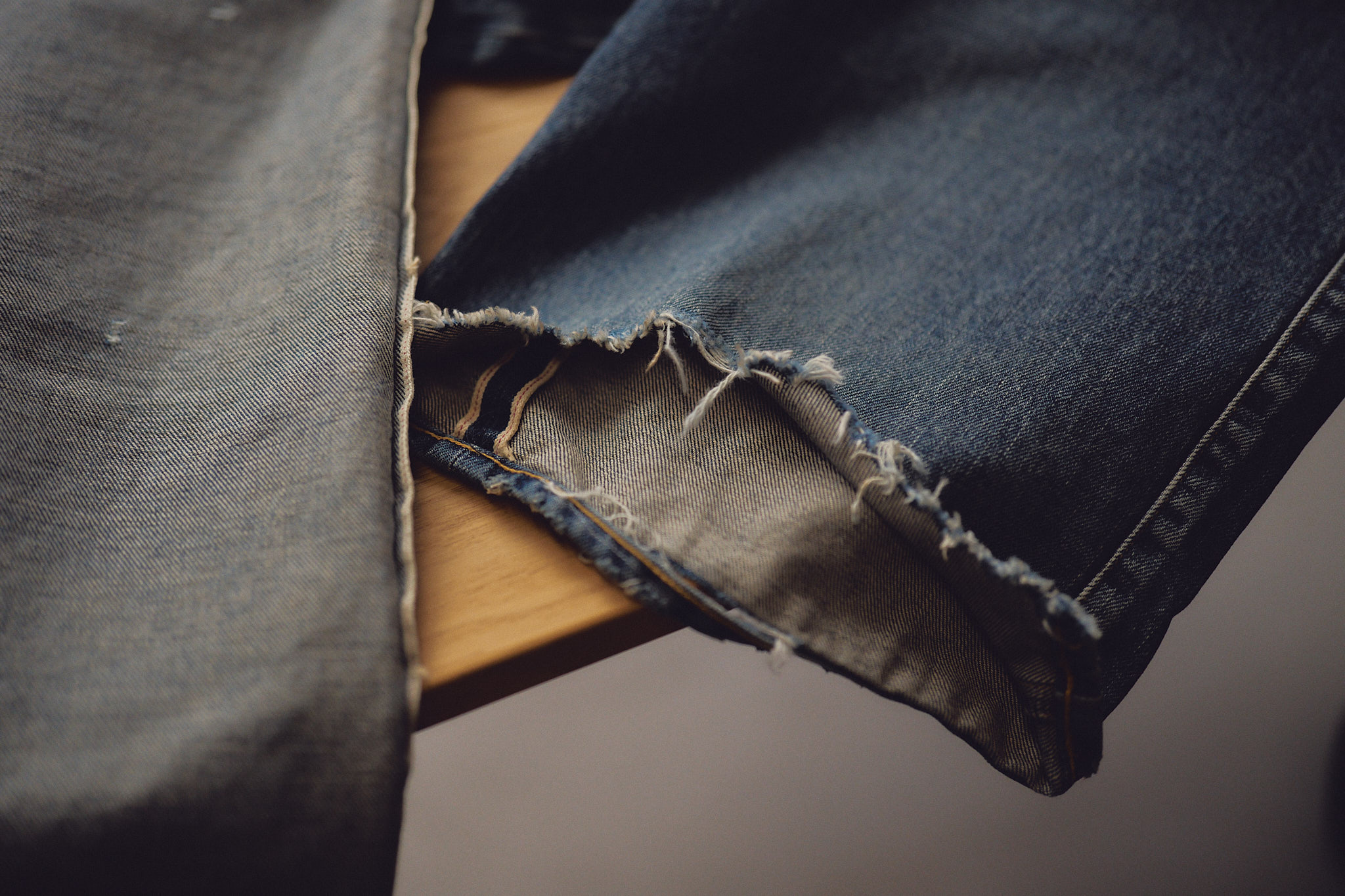 伊藤「自分でダブルエックスを渡しておいてあれなんですけど、僕も全然リプロを求めているわけじゃないんですよ。でも完成したデニムはついついディティールを一つずつ確認したくなっちゃって。このステッチを見た時に、多分わざとだろうなと思って、僕が思ってたこと中出さんの間での感覚の一致があってすごい嬉しかったですね。裾が破れてる僕のダブルエックスのディティールは再現されてたり、この個体特有の個性はきちんと汲んで反映してくれてますよね」